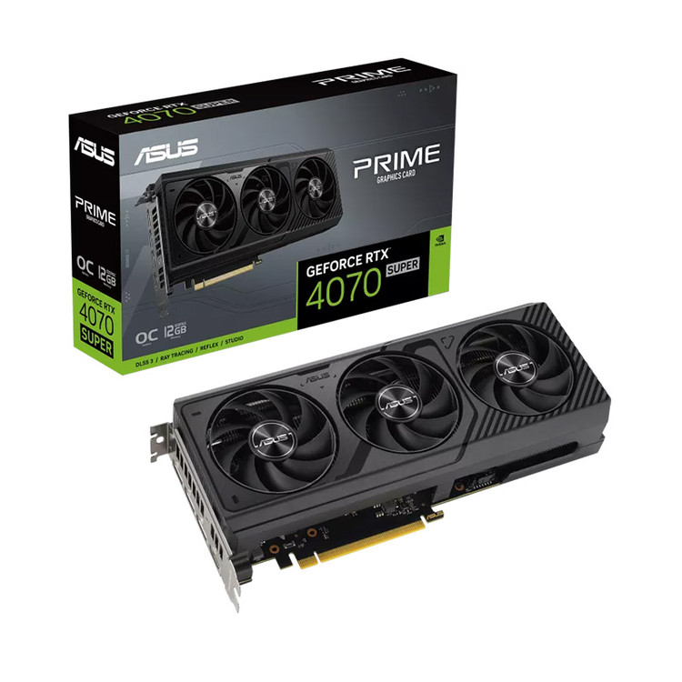 فرکانس بوست کارت گرافیک Asus Prime GeForce RTX 4070 Super OC کمپانی ایسوس 2550 مگاهرتز است. معماری کارت گرافیکهای سری 40، Ada Lovelace نام دارند که به لطف نسل چهارم هستههای تنسور و قابلیت جدید OPA پیشرفت چشمگیری در زمینه هوش مصنوعی داشته است. این کارت گرافیک از چیپ گرافیکی AD104 شرکت TSMC با لیتوگرافی چهار نانومتری بهره میبرد که 35.8 میلیارد ترانزیستور را در خود جای داده است. در این پردازنده گرافیکی، انویدیا 7168 هسته کودا یا همان هستههای سایه زن، 224 هسته نسله چهارم تنسور، 56 هسته نسل سوم رهگیری پرتو نور، 224 واحد نقشه گذاری بافت و 80 واحد خروجی رندر (ROP) را به کار گرفته و آنها را به 12 گیگابایت حافظه GDDR6X با سرعت 21 گیگابایت بر ثانیه، پهنای باند 504 گیگابایت بر ثانیه و رابط حافظه 192 بیتی متصل کرده است.